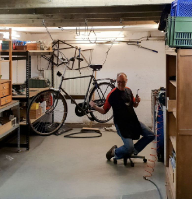 Dit is een foto van Jeroen in zijn werkplaats. Met een gebalde vuist en gereedschap maakt hij zijn trots als fietsenmaker kenbaar aan de fotograaf. ‘Yeah’